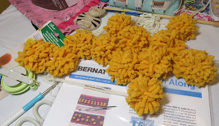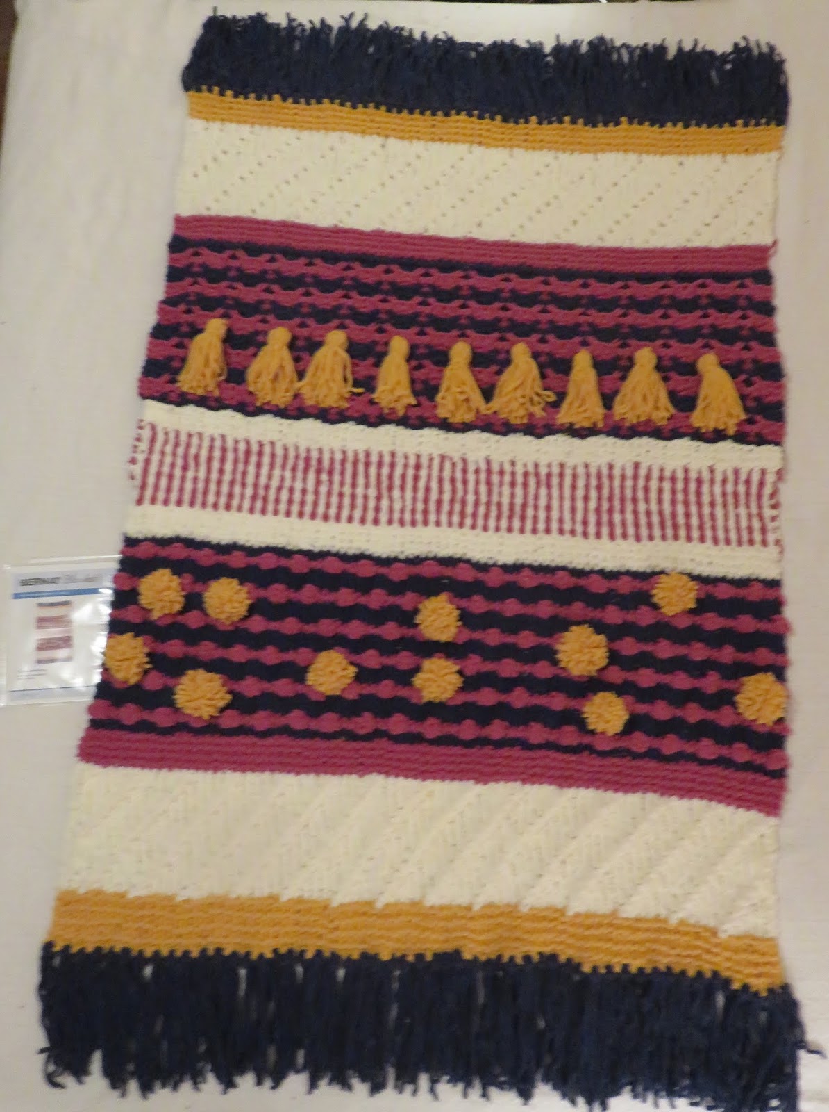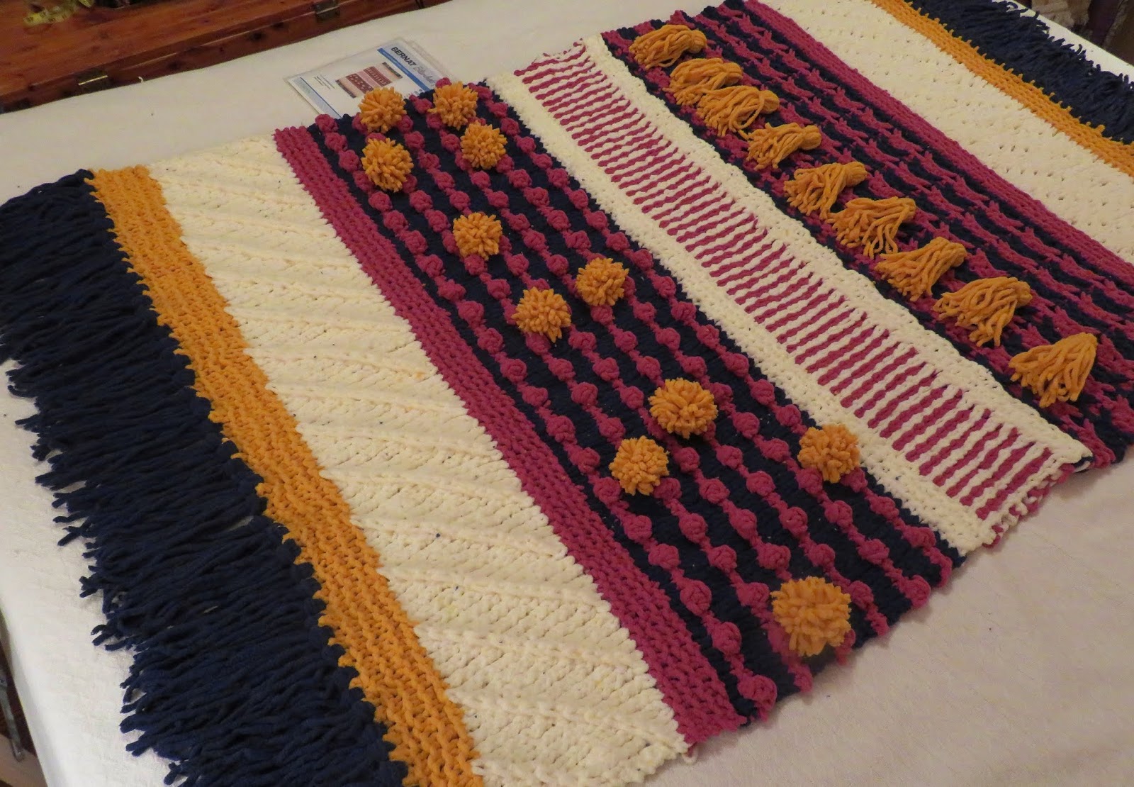 Every time I looked at this lovely blanket, I thought about the embellishing. So I bought a pom maker and once I got the hang of it - and the poms were similar, I added them to the blanket.
